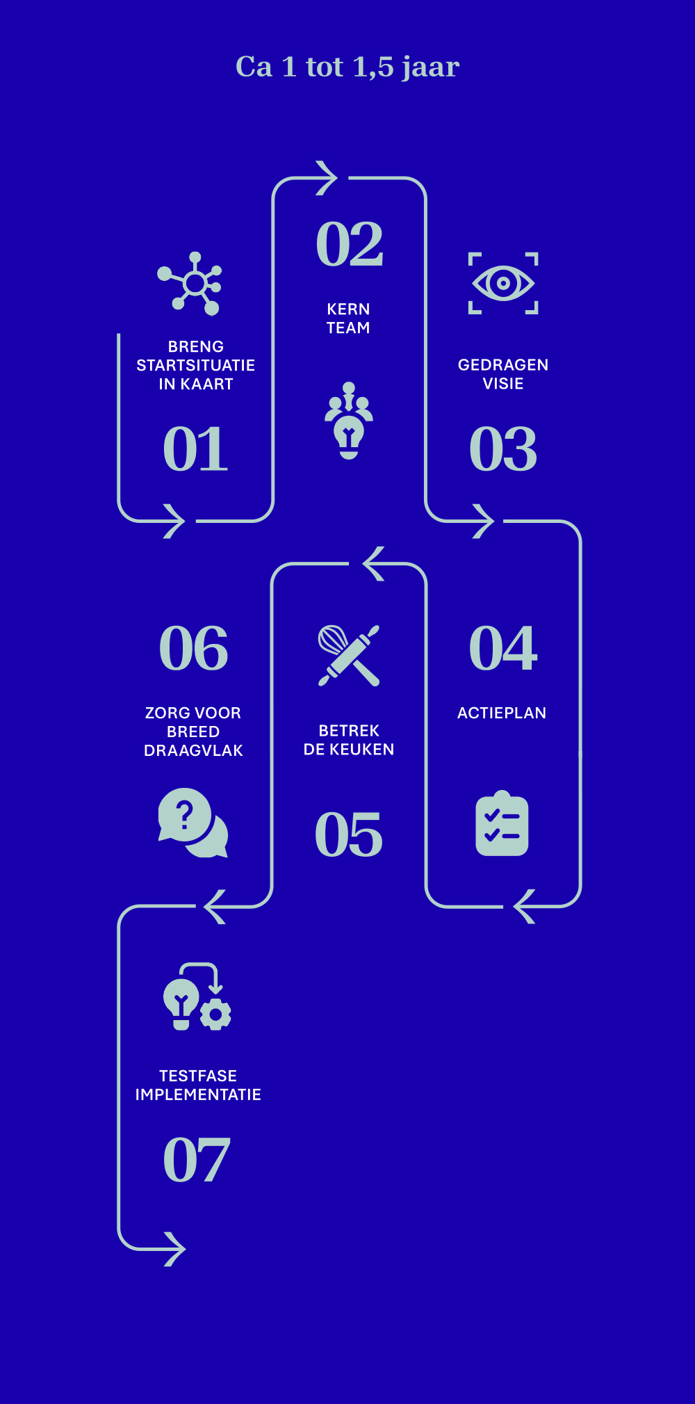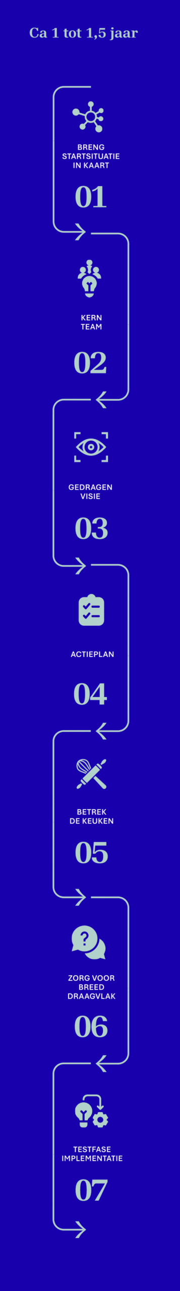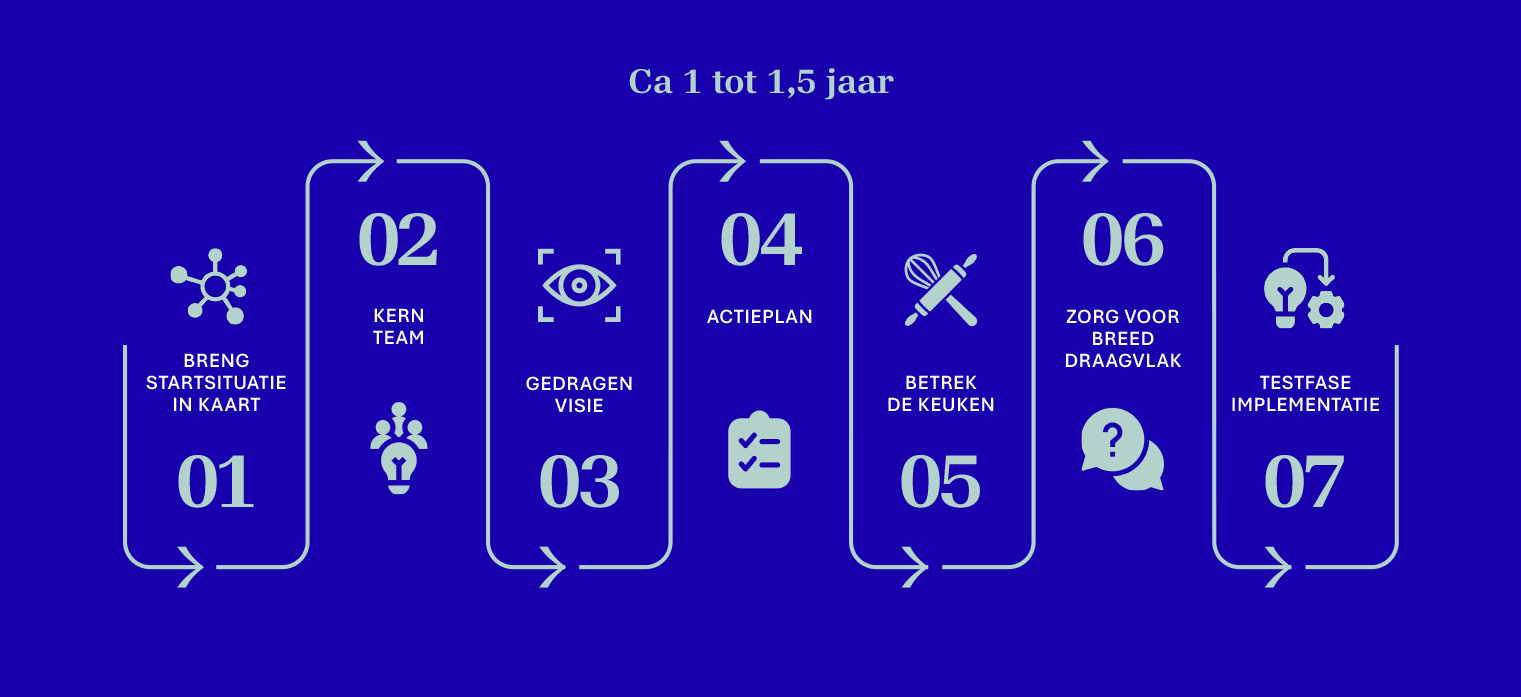Draagvlak over afdelingen heen is hierbij essentieel. Blijvende verandering is alleen mogelijk wanneer alle betrokken mee aan tafel zitten: chefs en keukenmedewerkers, logistiek verantwoordelijken, diëtisten, directie, zorg- en kamerpersoneel, artsen én andere zorgprofessionals. We creëren ruimte voor ieders stem en expertise, zodat iedereen zich betrokken voelt en zijn rol ten volle kan opnemen.
